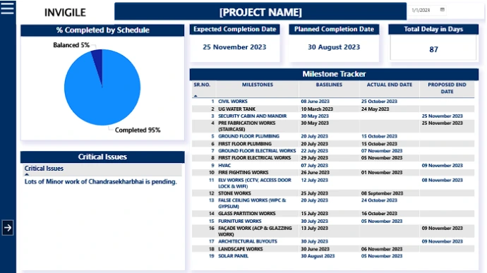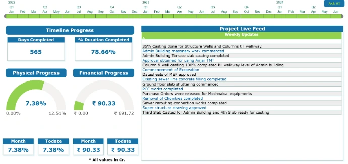 A Manufacturing company managing multiple projects faced challenges in tracking project performance across sites. Project information was stored across spreadsheets, reports, and various systems, making it difficult for management to obtain a clear view of project progress. A centralised portfolio management analytics dashboard was developed to provide leadership teams with real-time insights into project performance across all projects. Key benefits included: