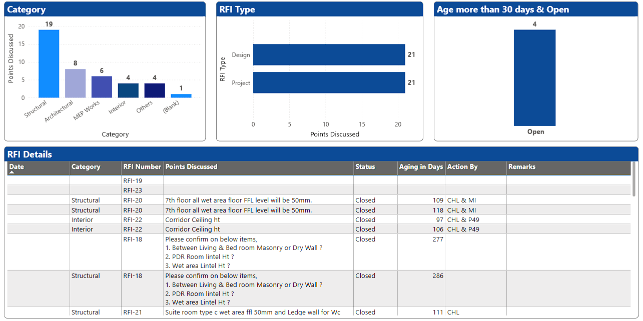 RFI Analysis is the systematic review and evaluation of RFIs (Requests for Information) raised during a project to understand causes, trends, response time, and impacts on cost, schedule, and quality. RFI analysis helps project teams prevent recurring issues, improve design quality, and enhance decision-making, leading to smoother project execution..